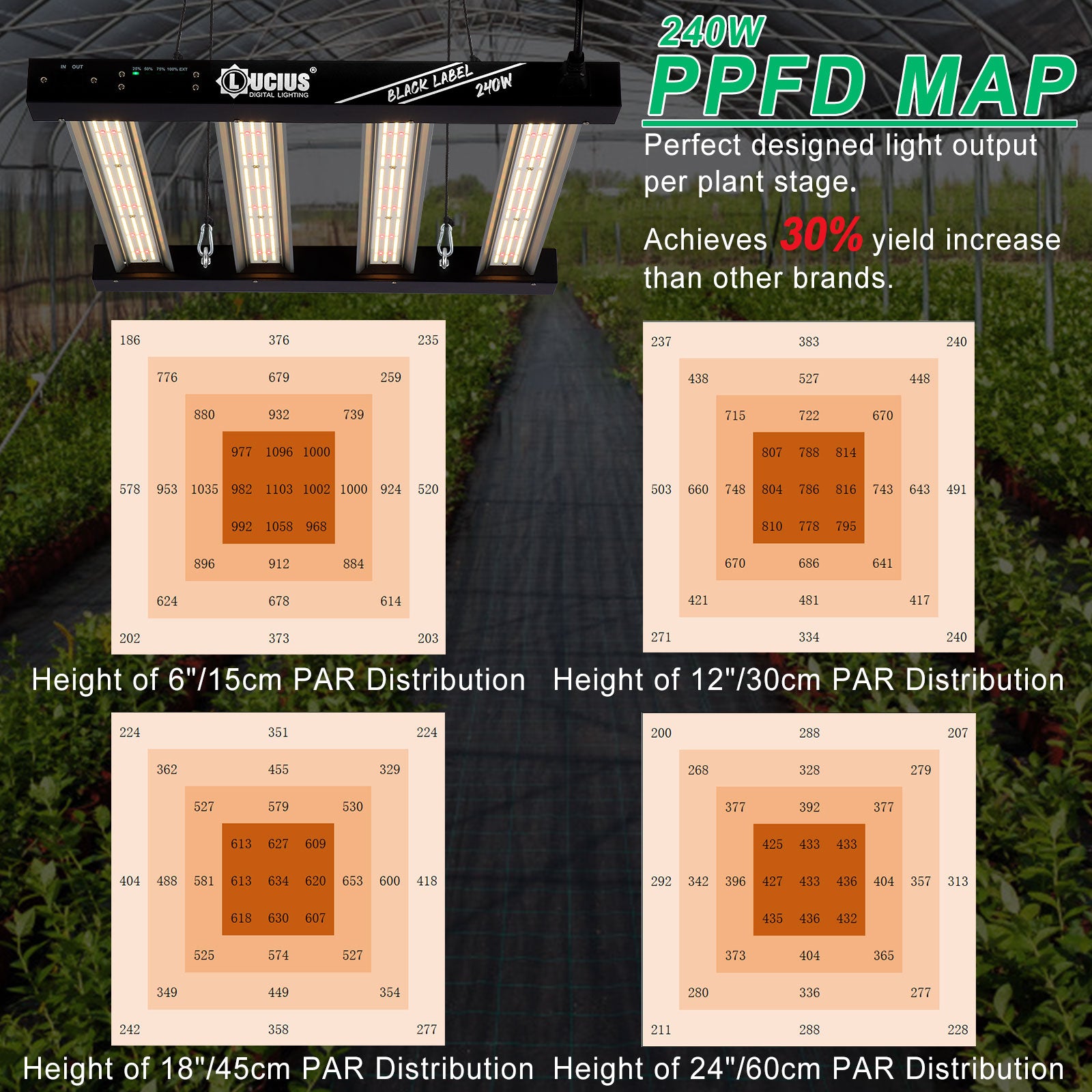 Optimized PAR Mapping: Achieves > 1000 µmol/m²/s at 15 cm for flowering and balanced intensity at all heights.