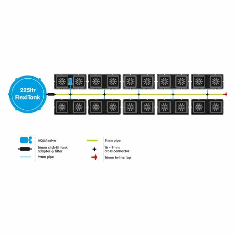 10 x Autopot Easy2grow (2 Pot) Accessory packs with AQUAVALVE 5. (Incl. 20 Marix Disks, 20 Square Potsocks, 5 x 12mm – 9mm Cross connectors & 10 x 1 meters of 9mm Autopot piping)