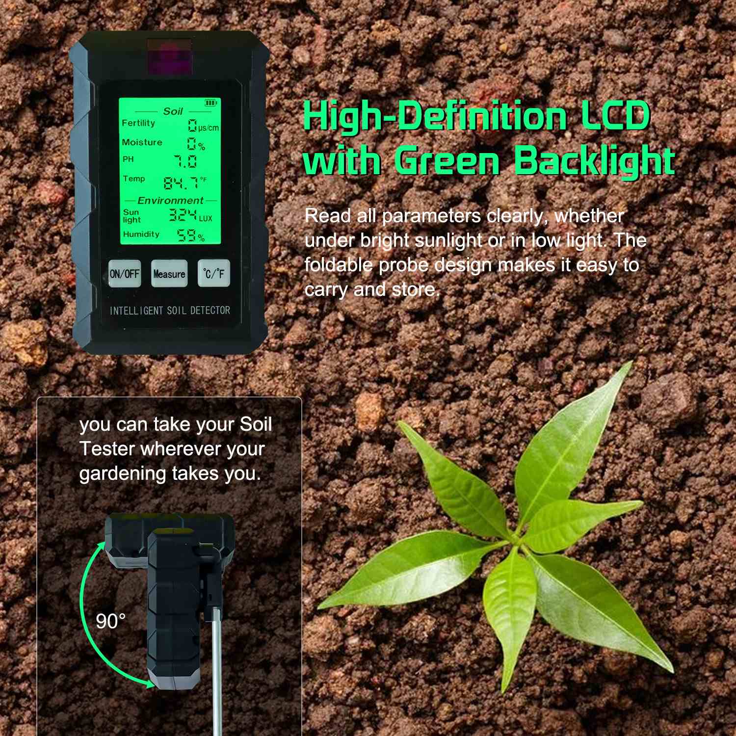 Read all parameters clearly, whether under bright sunlight or in low light. The foldable probe design makes it easy to carry and store, so you can take your Soil Tester wherever your gardening takes you. -