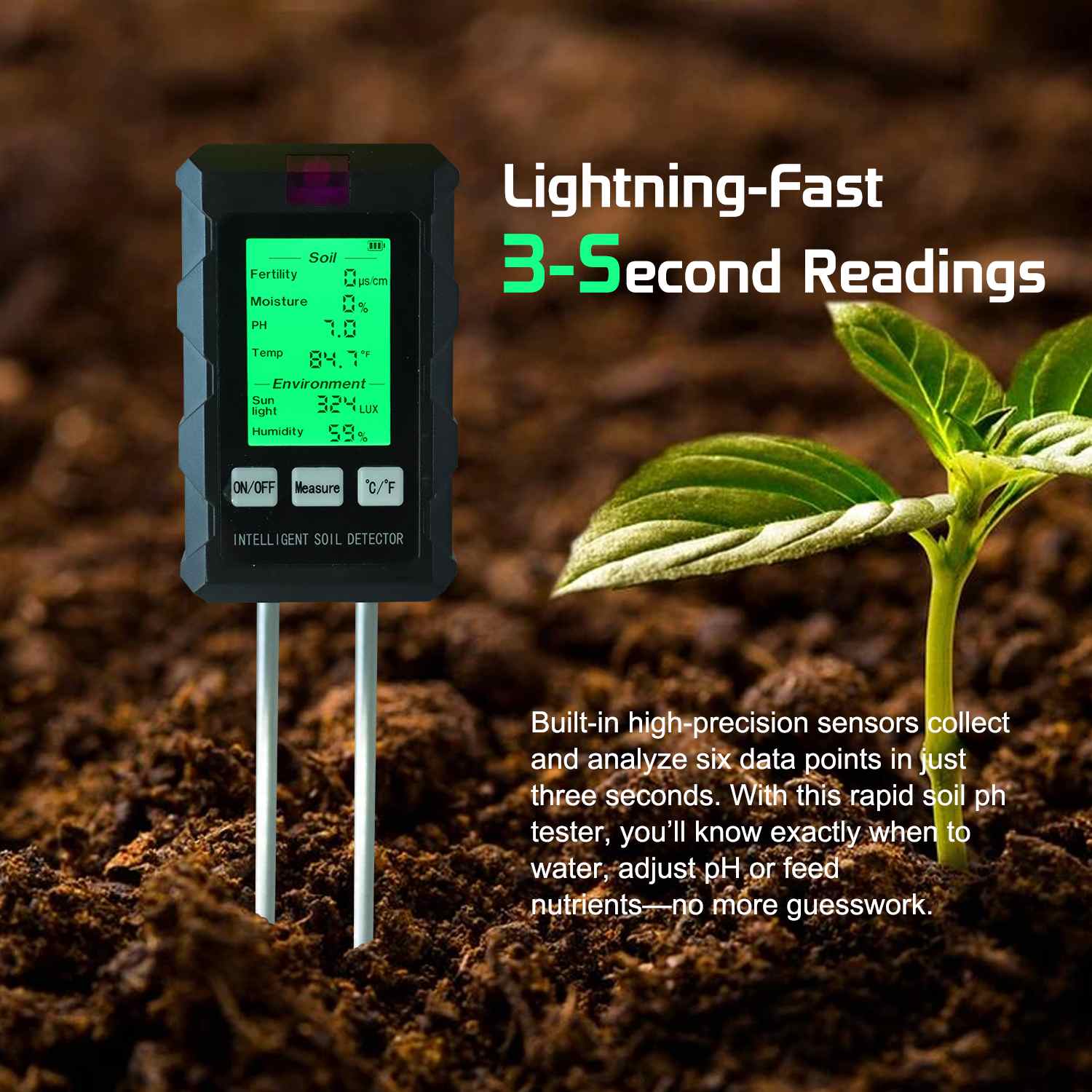 Built-in high precision sensors collect and analyze six data points in just three seconds. With this rapid soil ph tester, you’ll know exactly when to water, adjust pH or feed nutrients—no more guesswork. -
